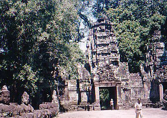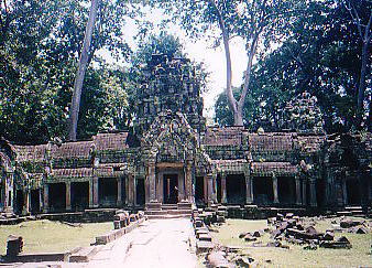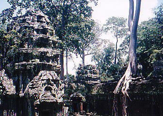 | タ・プローム(Ta Prohm)・・・発見当時のまま残されているので、右のように巨大に成長したスポアン(榕樹)に押しつ ぶされたそうになっている。 このような自然の脅威を見せつけられる寺院である。 |