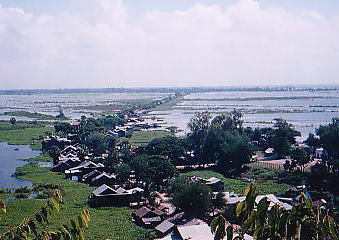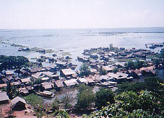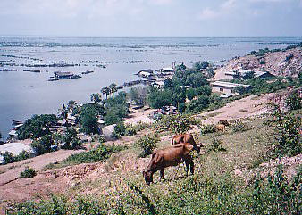 プノン・クロム(山)から臨むトンレサップ湖とその向こうのシェムリアップの町。 雨季にはこのように湖の面積が増大する。 |