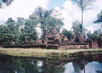バイタクが着いた場所には、土産物屋や屋台レストランなどがズラッと並んでおり、ここもやはり観光ルートの一つに入っているのを感じた。 長男さんと別れてカードチェックの要らない入り口から入って行く。 このバンテアイ・スレイは、ガイドによれば967年に当時の王師の菩提寺として建築された、「女の砦」の意味を持つ寺院らしい。 寺院は周囲400メートル四方と比較的小さいが、長い参道を通って第一周壁の門を入るとそこには、濠の向こうに赤茶けた美しいミニチュアのような寺院が僕を待っていた。 僕は吸い込まれるように第二周壁の門に歩いて行った。 |