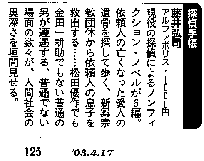 暖かくなってきて酒と花と読書の季節だね。 イラクへの武力行使、北朝鮮の脅威、テロへの不安、株式の変動、リストラ高失業率、銀行の失墜、年金危機、陰湿犯罪の激増、国会議員の不祥事、女性専用車の増加、等々、周りを見ても何もスカッとすることがない。 こんな時は桜の木の下で酒でも飲んで、「探偵手帳」を読んでリフレッシュしよう! 読み終わったあとは、勇気凛々、気分爽快、天下泰平、意気揚々となるでしょう。 さあ、年度変わりだし、みなさん新たな気分で頑張ろう! トップの販売書店一覧表にない書店でも、全国の有名書店でたくさん扱ってくれています。是非この「探偵手帳」を読んで、僕に感想をくださいね。 |