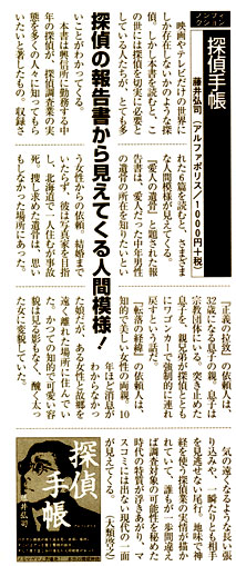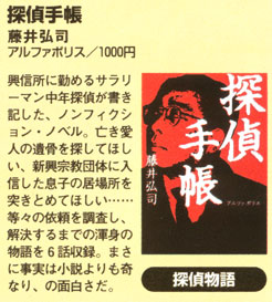 | お知らせ 「アッと驚く探偵手帳」の有料版メールマガジンが、前号までスーパー探偵とズッコケ探偵を長きに渡って連載してまいりましたが、前号で最も無能な探偵を記述して終わりました。 次号の六月八日号より、現在好評発売中の「探偵手帳」の続編とも言うべき「探偵手帳2」をにらんだノンフィクション物語を連載いたします。 過去に担当した案件で、感動的なものや驚愕したものなどをプライバシーに配慮しながらの物語となります。 どうぞこの機会に購読してみてください。 登録は→ http://premium.mag2.com/reader/servlet/Search?keyword=P0000515&type=mag 一ヶ月四回配信で、月額300円です。 |