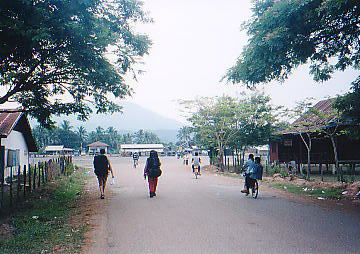 おそらく僕の記憶では、隣の大音響スピーカーからのドコドコドンドンは深夜三時頃まで鳴り響いていたと思う。 しかしそれに対して誰も文句を言わないから鳴り続けていたわけで、ラオス人の寛容さというか、ツーリストたちの順応性というか、僕にはサッパリ分からない。 僕はかなり寝不足のまま、午前七時半頃にR子さんがドアをトントンと叩く音に目が覚めた。 慌てて水シャワーを浴びて髭を剃り中庭に出ると、ちょうど彼女が宿代を女将さんに支払っているところだった。昨年と同じで三万Kip(約三百円)である。 女将さんに、「ちょっと彼女を送ってきます」と言って、僕が彼女のバックパックを背負い、タビソックGHをあとにした。彼女はバックパックを僕が背負ったことを大変恐縮していたが、僕にできることはこれくらいのことしかないのだ。 飛行場跡の向こうがバス発着場