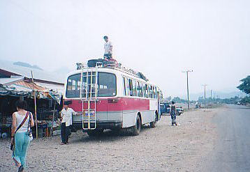 屋台を出た。 バスは九時発である。 現在の時刻は八時四十分。次第にバスの周りに旅行者が溢れてきた。大部分が欧米人である。バスで移動する時は、できる限り早い時刻に来て、座席を確保することをお奨めする。特にこのような七時間もの長時間乗る場合は、万が一座席がなくなると、プラスティックの簡易座席に座るか、立ったままという破目になる。 バスをバックにR子さんの写真を撮って、いよいよお別れだ。旅の初日から三日間、寝る時以外はずっと一緒だっただけに、少し分かれ惜しくなってしまう。 彼女の方から、「今度は大阪でお会いしましょうね。携帯の方に電話ください」と言ってくれた。僕はその言葉を聞いて狂喜乱舞しそうになったが、何かを彼女のためにしたくて、近くの店に入ってお菓子やチョコレートを買って彼女に手渡した。 「それじゃ、このあと気をつけてね。バスが発車するのを見送るのは苦手だからここで宿に帰ることにするよ」 僕達は最初で最後かも知れない握手を交わして別れた。 飛行場跡を僕はGHの方にトボトボと歩く。途中何度か振り返るとバスはまだ出発していない。九時になっていないのだから当たり前であるが。 僕は腑抜けのようになって宿に帰り、ベッドに仰向けに倒れ、そのままうたた寝をしてしまった。 |